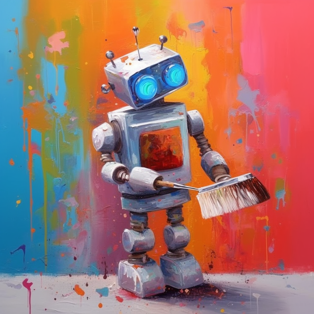These are playful images of simple, cheerful robots holding a broad paintbrush. Each image drips with color. Even the adorable robot painters are dripping with paint.