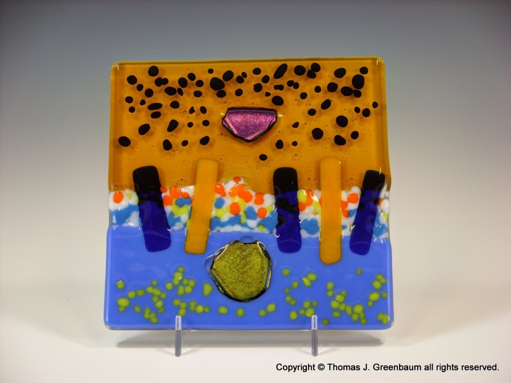 Fused glass plate with dichroic glass tack-fused. Abstract composition.