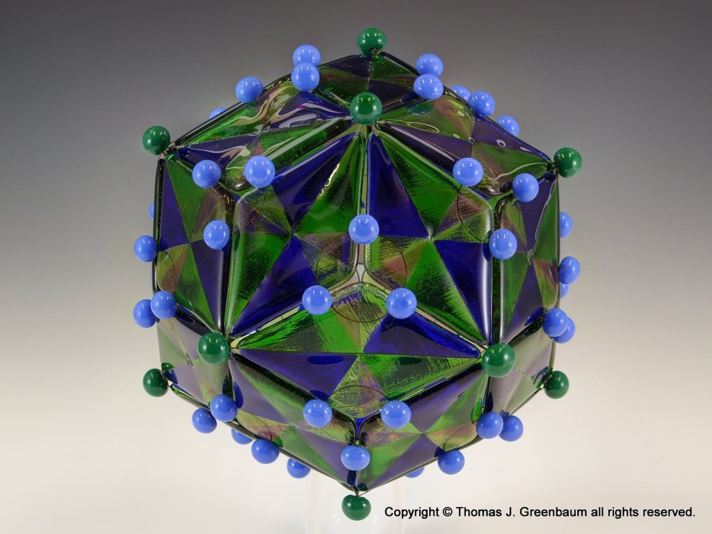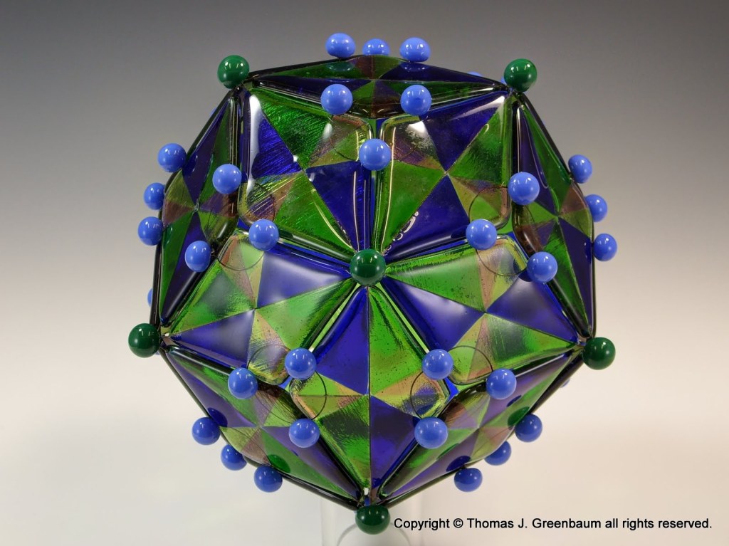 Glass sculpture comprising a 30-sided geometric figure called a triacontahedron. It is composed of 30 golden-rhombus fused glass panels. The panels are joined together with embedded stainless steel wire. The wire junctions are covered with 72 flame-worked glass beads (60 blue beads and 12 green beads). The green beads are at the vertices of an icosahedron.