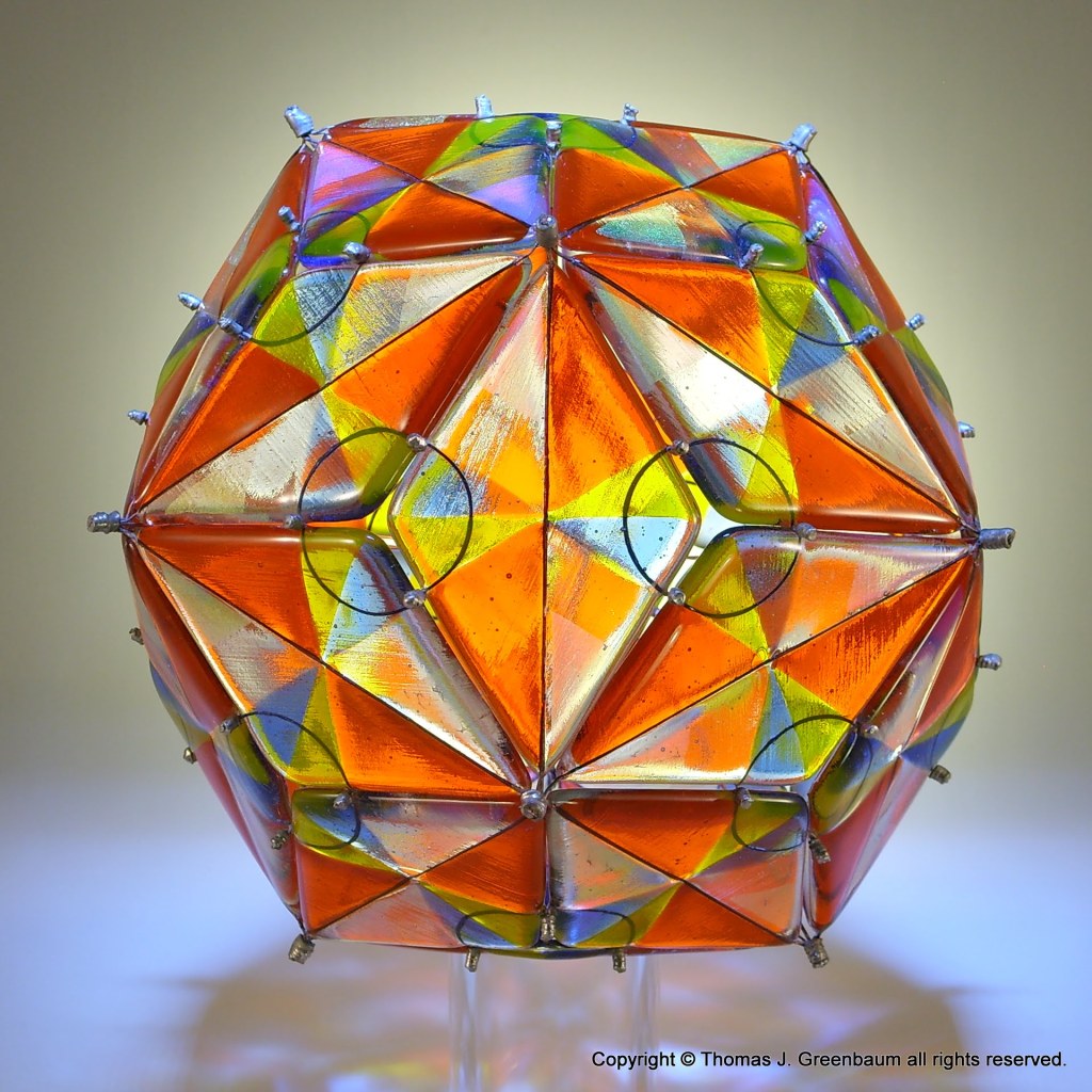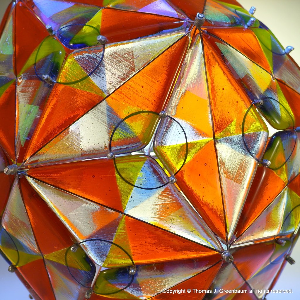 Creating a single golden rhombus in fused glass is virtuous. But successfully joining thirty glass rhombus in a spherical rhombic triacontahedron is transcendent. The individual glass facets join together with an embedded copper wire network to form a unique glass vessel that encompasses space, color, light, movement, texture, transparency, reflection, and radiance in a whole greater than its parts.