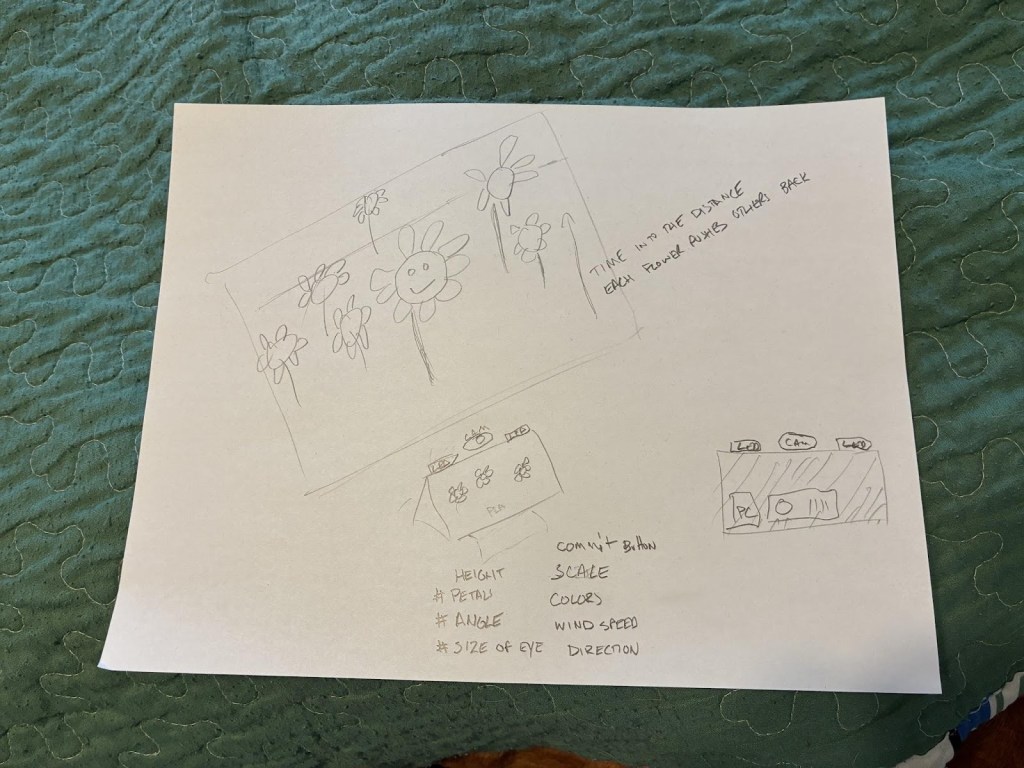 This installation encourages community and whimsy. Participants will engage with a physical sunflower console to craft their own personal digital Sunflowers. By manipulating the various buttons and knobs, users can adjust colors, petals, seed density, size and angles to create their own unique flowers. The console will incorporate their face into the seed portion of the sunflower. These individual flowers will then join the digital field of other participant’s flowers creating a community of visitors. New flowers will slowly replace older flowers throughout the week providing participants a view across time of community members.